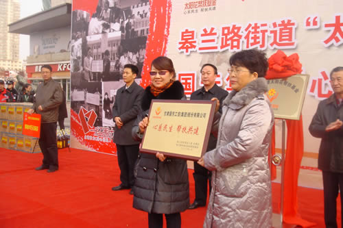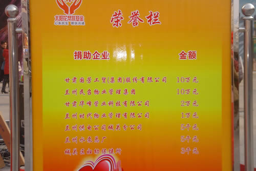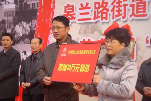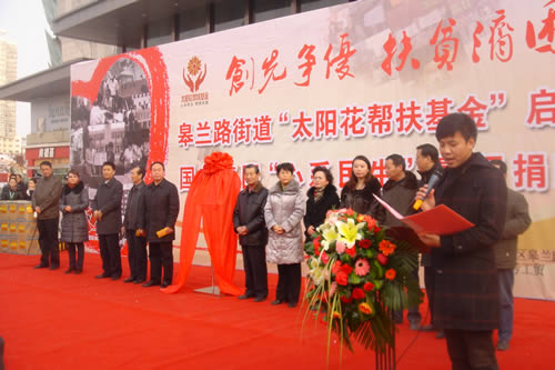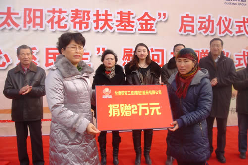 2012元月6日下午3時,甘肅國芳集團聯(lián)合城關區(qū)皋蘭路街道黨工委、辦事處舉行了“創(chuàng)先爭優(yōu)、扶貧濟困”太陽花幫扶基金啟動儀式,充分體現(xiàn)民生為本的服務宗旨,著力搭建社會幫扶救助平臺,切實解決弱勢群體實際困難,促進和諧街道建設。