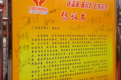 與會領導分別在太陽花幫扶基金倡議書簽名,倡議大家都能有樹立助人為樂、助人為榮的觀念