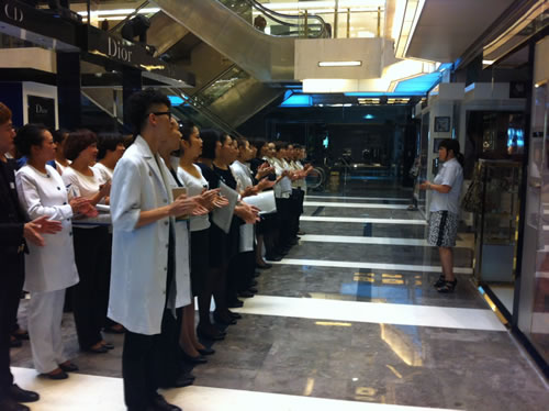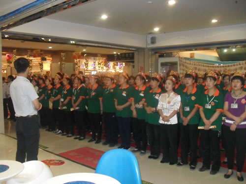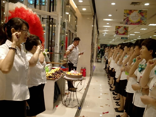 1、F1精品、化妝部主管向各位員工做店慶動員。