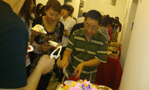 15、職能部門冷餐會,大家分享著美味的蛋糕和甜點。