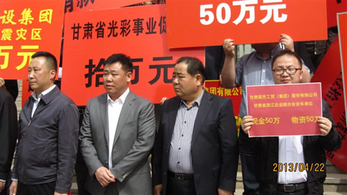 2013年4月22日下午15時(shí),在甘肅省政協(xié)一樓,由甘肅省委常委、省委統(tǒng)戰(zhàn)部部長(zhǎng)澤巴足,省委統(tǒng)戰(zhàn)部副部長(zhǎng)、甘肅省工商聯(lián)黨組書記、第一副主席吳繼德等相關(guān)領(lǐng)導(dǎo)出席了“甘肅省商會(huì)非公經(jīng)濟(jì)人士向四川雅安災(zāi)區(qū)獻(xiàn)愛心捐贈(zèng)儀式”。捐贈(zèng)現(xiàn)場(chǎng)眾多甘肅省非公企業(yè)向4月20日雅安市地震災(zāi)區(qū)進(jìn)行了捐贈(zèng),廣大愛心企業(yè)和人士用自己的實(shí)際行動(dòng)對(duì)災(zāi)區(qū)同胞奉獻(xiàn)了自己的真情和祝福。