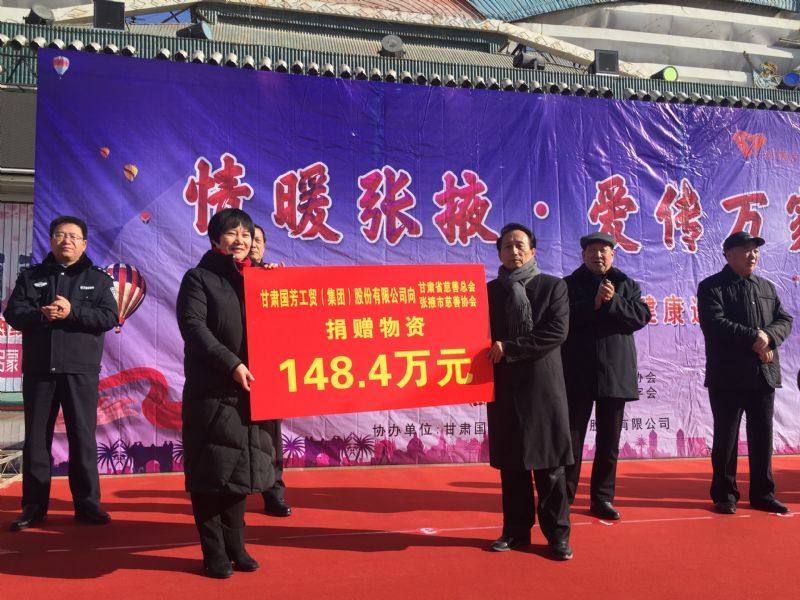 2019年1月11日,甘肅省慈善總會(huì)、張掖市慈善協(xié)會(huì)、甘州區(qū)慈善協(xié)會(huì)以及臨澤縣紅十字會(huì)攜甘肅國(guó)芳工貿(mào)(集團(tuán))股份有限公司在張掖市中心廣場(chǎng)共同舉行“情暖張掖·愛傳萬家”送健康送溫暖活動(dòng),將2000套棉衣,2000余套秋衣秋褲,27臺(tái)彩電以及300余件小家電合計(jì)價(jià)值148萬元的過冬物資帶給山丹縣,民樂縣的困難群眾,將2500個(gè)醫(yī)藥箱帶給臨澤縣的老人們。此次活動(dòng)傳導(dǎo)社會(huì)幫扶、精準(zhǔn)扶貧精神的同時(shí)也默默為社會(huì)傳導(dǎo)著一份正能量。