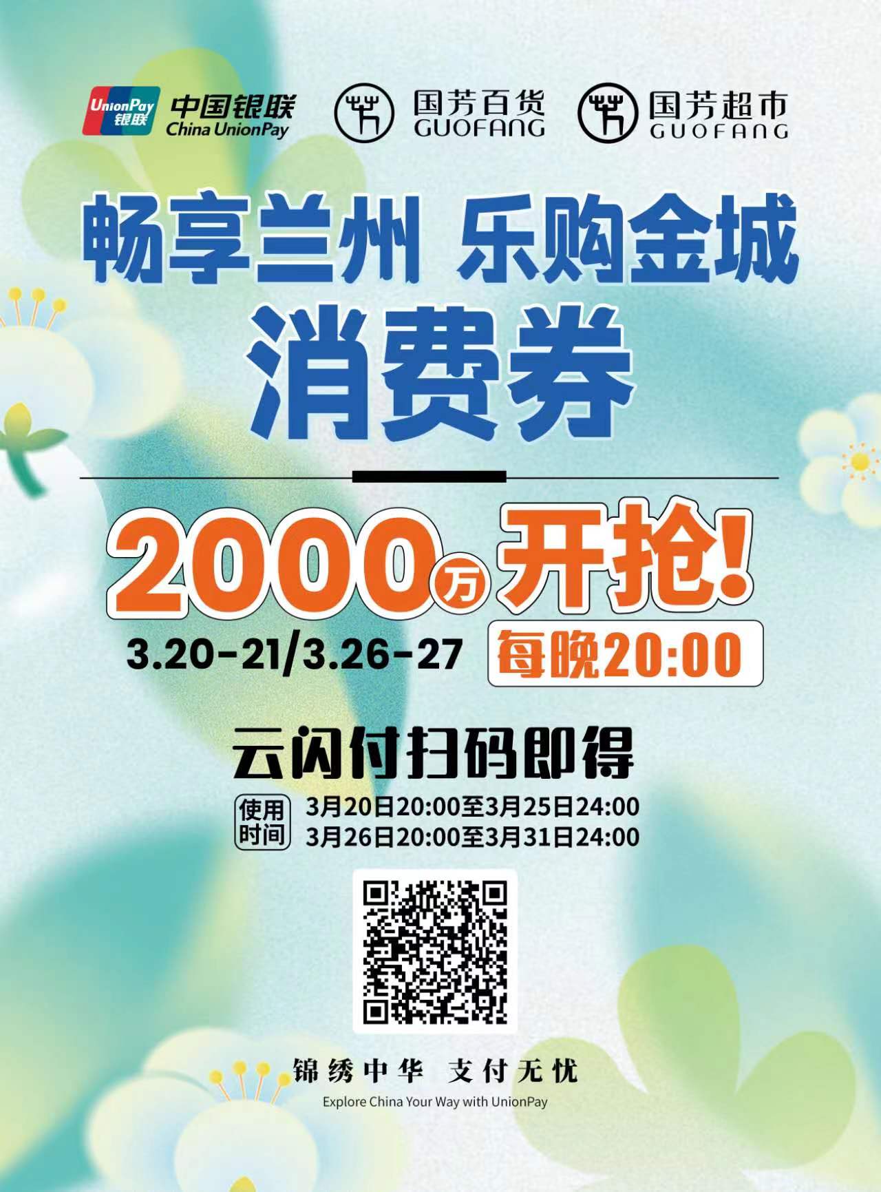 本次消費(fèi)券具體發(fā)放時(shí)間為3月20日至3月31日,將分2個(gè)階段4個(gè)批次發(fā)放,分別為3月20日、3月21日、3月26日、3月27日的每晚20:00至24:00。消費(fèi)券涵蓋國(guó)芳百貨、國(guó)芳超市以及國(guó)芳百貨內(nèi)的餐飲場(chǎng)所等3個(gè)場(chǎng)景共計(jì)38萬余張,消費(fèi)范圍覆蓋美妝、服飾、餐飲及國(guó)芳超市等多品類消費(fèi)場(chǎng)景,旨在激發(fā)春季消費(fèi)潛力,鞏固傳統(tǒng)消費(fèi),共同繁榮城關(guān)商貿(mào)經(jīng)濟(jì),助推零售商業(yè)市場(chǎng)平穩(wěn)發(fā)展。(廣大市民將通過“云閃付”APP領(lǐng)取并核銷,具體活動(dòng)規(guī)則、適用范圍等信息可登錄“云閃付”APP查看。)