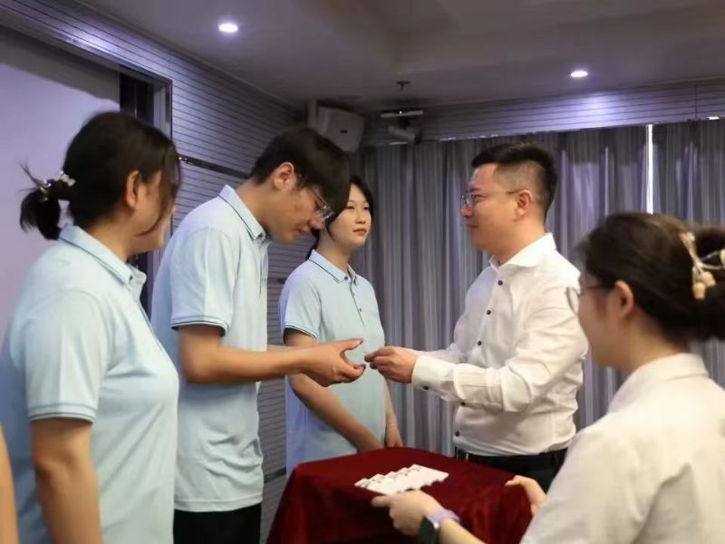 伴隨著激昂的音樂(lè),入職儀式進(jìn)入了發(fā)放工牌的環(huán)節(jié)。國(guó)芳集團(tuán)各位領(lǐng)導(dǎo)面帶微笑,將蘊(yùn)含著公司信任與期望的工牌并伴手禮交到新員工手上,工牌在燈光的照耀下,折射出他們堅(jiān)定的信念和對(duì)新征程的信心。